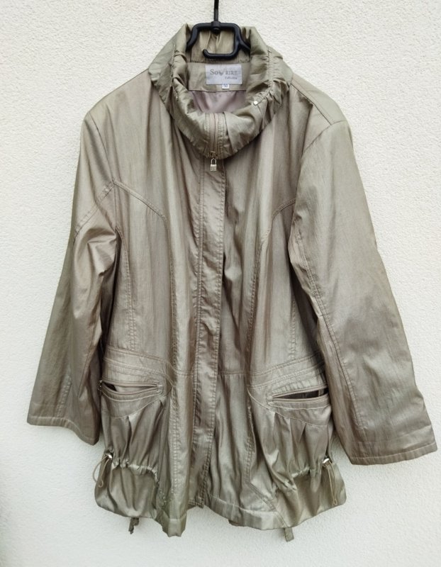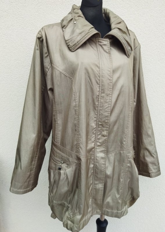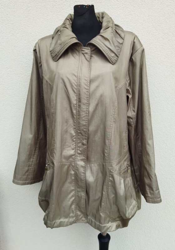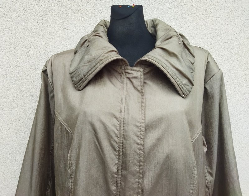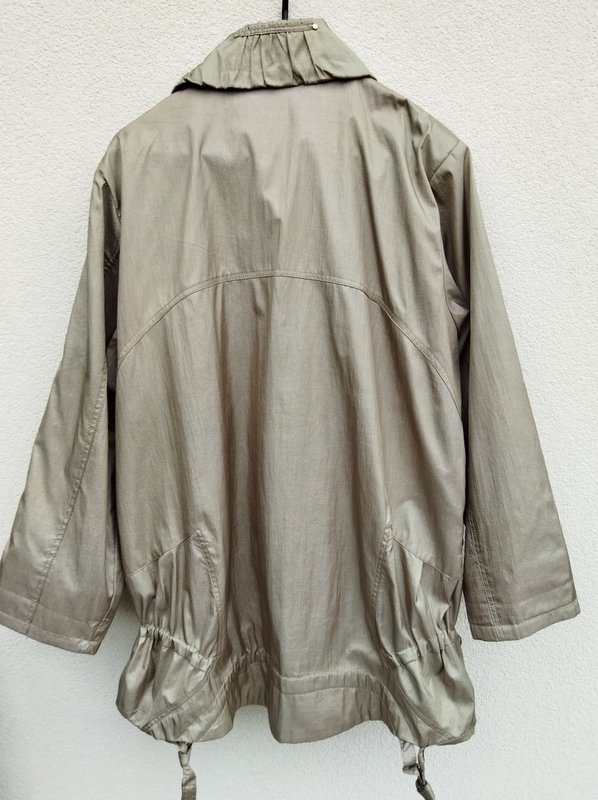 Kurtka z a' la parka z poliestrowej tkaniny z lekko metalicznym połyskiem w kolorze oliwkowej zieleni. starannie uszta z licznymi detalami . Zapinan na zamek ukryty pod plisa zapinana na napy, u dołu dwie wpuszczane kieszenie z zamkami, ściągana troczkami w dwóch miejscach u samego dołu i na wysokości dołu końca kieszeni. Całość na podszewce w kolorze kurtki.