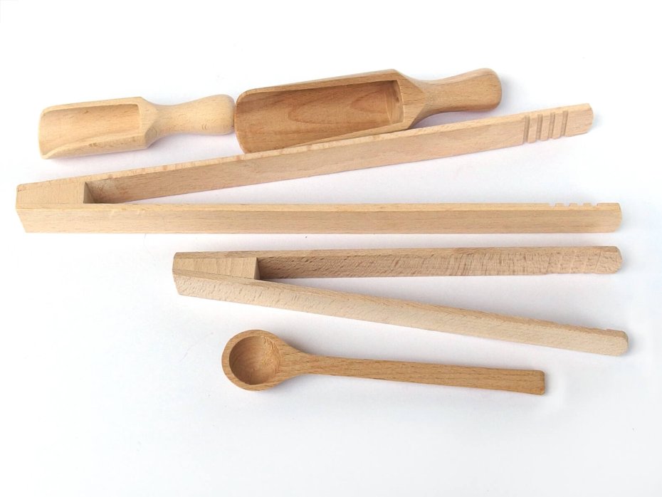 - figurki drewniane ( dinozaury, auta, zwierzęta, figurki ludzików, klocki, ringi, walce, sześciany itp.) które są różnej wielkości, dzięki czemu ćwiczymy chwyt małej rączki