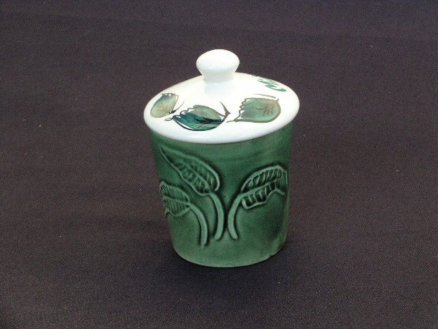 Naczynko porcelitowe z przykrywką - na rarytas miętowy, według angielskich zasad stołowych celebracji :) Przykrywka z dziurką na łyżeczkę, ręcznie malowana. Dół ryflowany miętowych liści wypukłym wzorem, w pięknym kaflowym tonie zieleni. Szkliwienie wewnątrz, błyszczące. Bez sygnatury. Słodycz... miętowa :) Dół 5; góra 6,5; wysokość 9 cm. Stan zachowania dobry..Wada fabryczna na rancie. - poza rym bdb.
