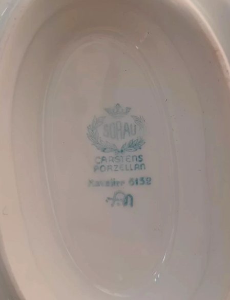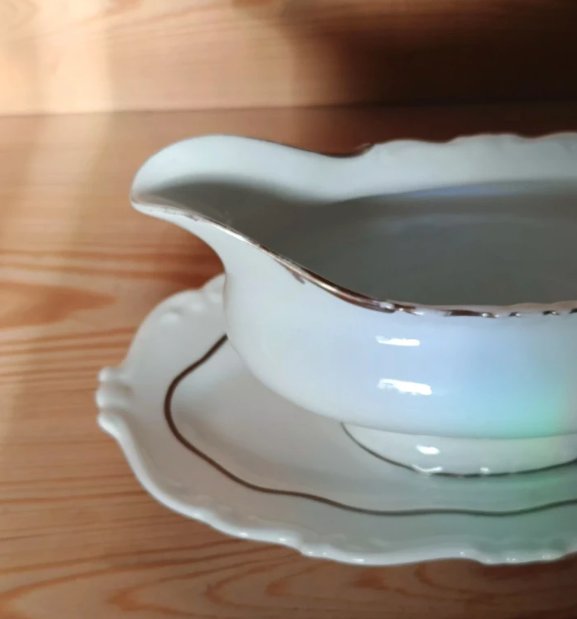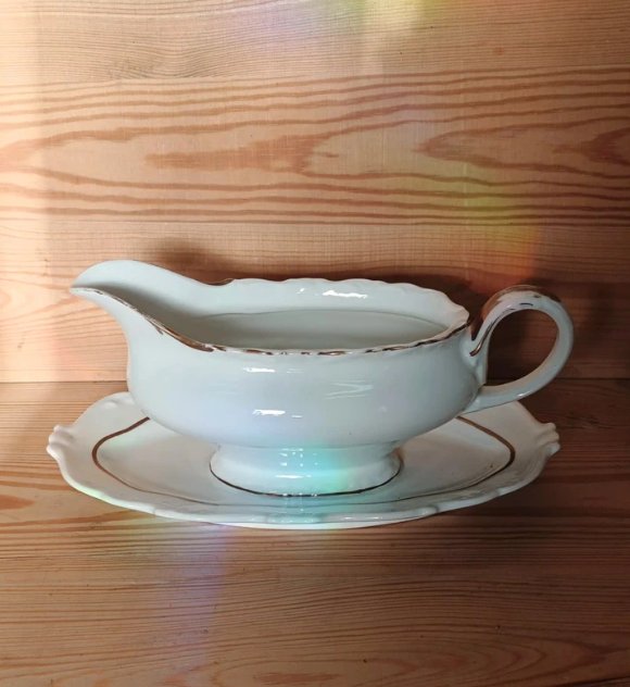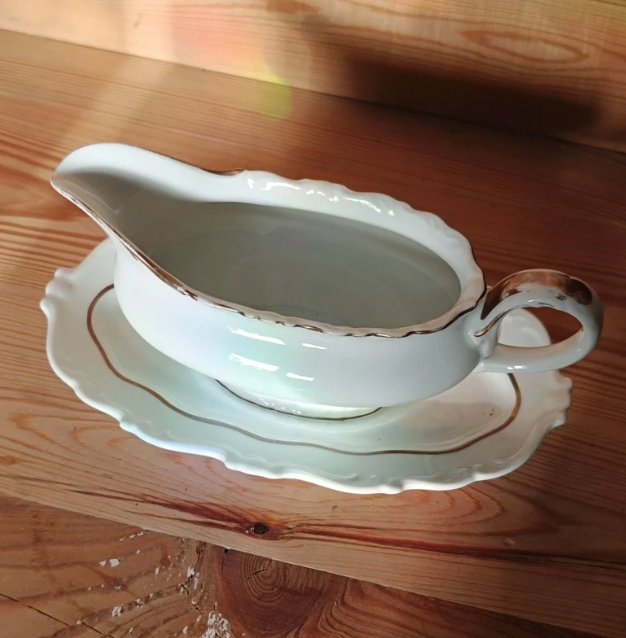 Śliczna sosjerka z białej porcelany ze złoceniami. Sygnowana Sorau. Wysokość 11 cm, podstawa ok 14x24 cm