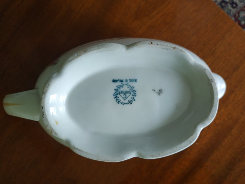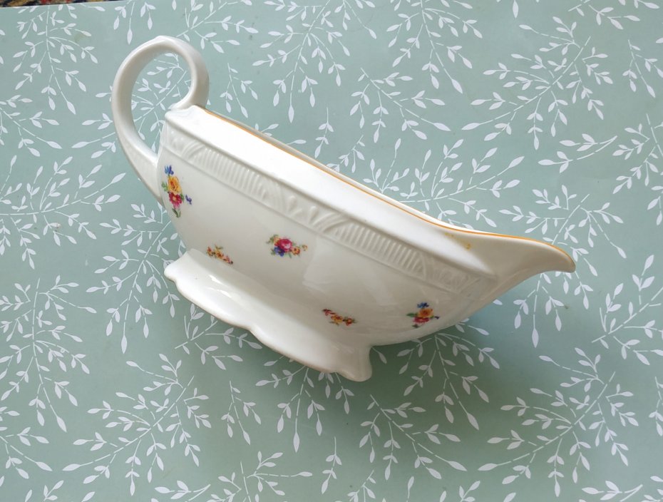 porcelanowa sosjerka w kolorze ecru z drobnymi kwiatkami, wyprodukowana w Polsce, w Chodzieży.
