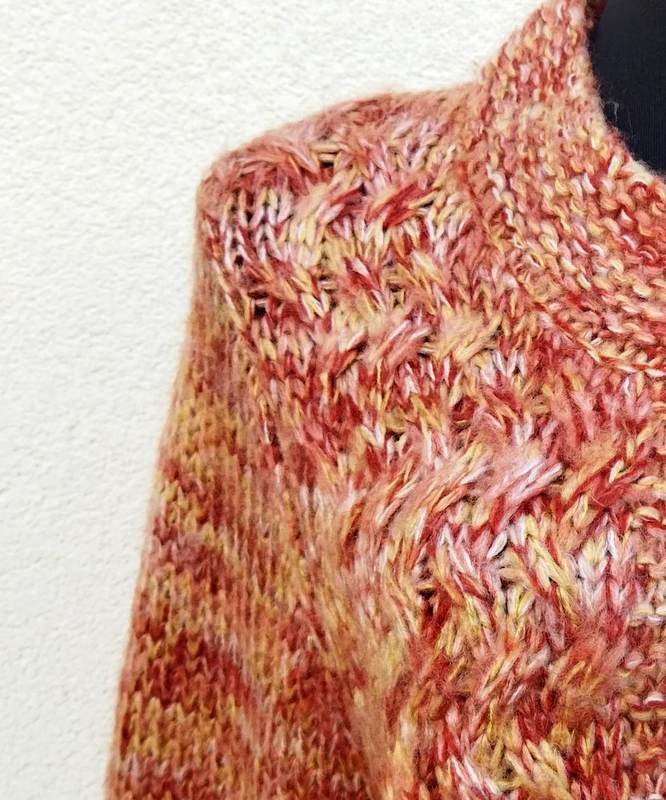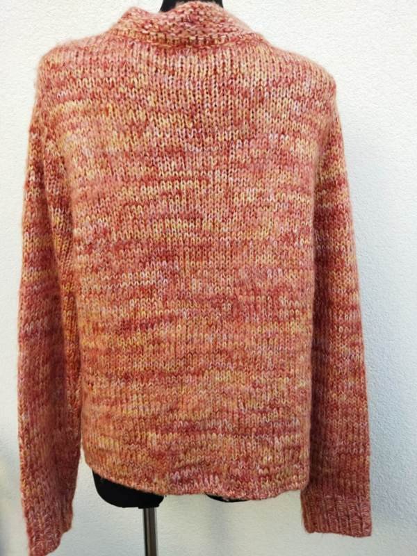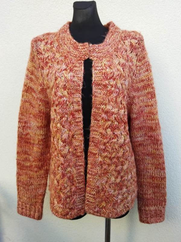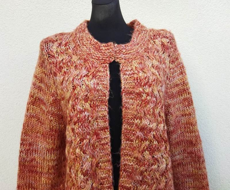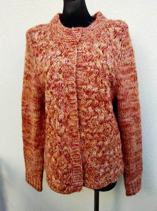 Miły, miekki sweter z akrylowej włóczki w melanżowej beżowo-żółto-cynamonowej kolorystyce, z połami przodu z ozdobnym zaplatanym wzorem. fason otwarty - bez zapiecia. Wykończony ściągaczami.
