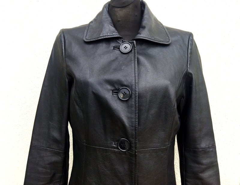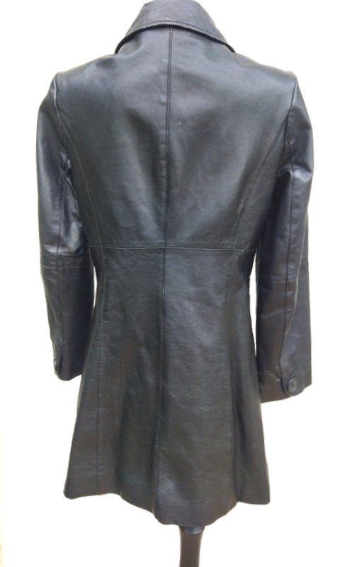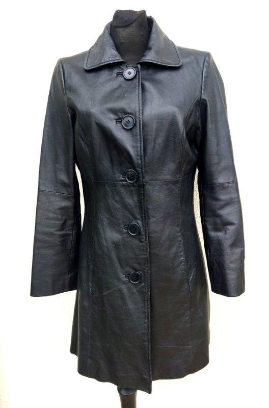 Zgrabny płaszcz z mięciutkiej naturalnej skóry licowej w czarnym kolorze. Odcinany w pasie , góra dopasowana z kołnierzem, dół trapezowy poszerzany szyty z klinów, z dwiema wpuszczanymi kieszeniami. Zapinany na guziki. Całośc na podszewce.