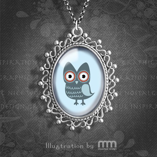 Naszyjnik w srebrnej oprawie - SOWA BLUE - to bardzo romantyczne, nostalgiczne i kobiece malutkie dzieło sztuki. Obrazek pod szkiełkiem to wesoła miniaturka graficzki opracowanej w moim studio. Grafika i naszyjnik to połączenie nowoczesności z romantycznym antycznym nastrojem. W innej ofercie można zobaczyć kolczyki z tym samym motywem.