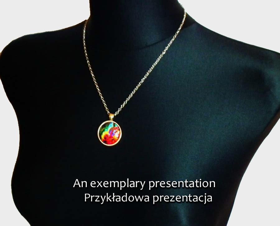 Romantyczny, oryginalny naszyjnik z grafiką artystyczną zatopioną pod wypukłym szkłem, w oprawie w kolorze srebra. Biżuteria ta jest jedyna w swoim rodzaju i niespotykana, głównie dzięki szkłom z grafiką, które są unikatowe, wykonane ręcznie według mojego projektu.