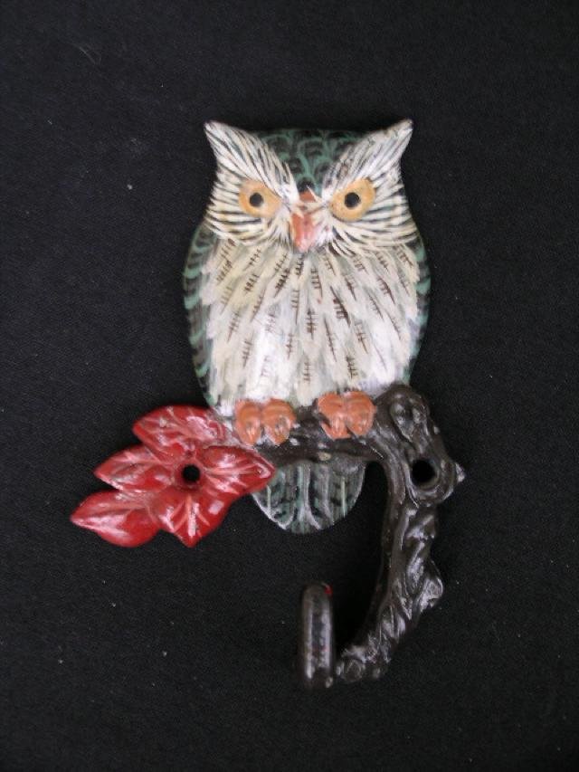 Zabawny, plastikowy a precyzyjnie ręcznie umalowany sowi haczyk. Z dwiema dziurkami do umocowania. Delikatność cieniutkich śladów pędzelka i trafność w doborze tonacji sowiego upierzenia :) Praktyczny, dowcipny, dekoracyjny. Oko cieszący :) i tego, co na nim zawiśnie - pilnujący :) 10 x 7,5 x 2,5 cm. Stan zachowania dobry.