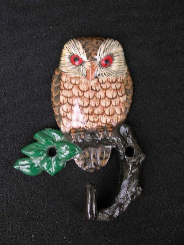 Zabawny, plastikowy a precyzyjnie ręcznie umalowany sowi haczyk. Z dwiema dziurkami do umocowania. Delikatność cieniutkich śladów pędzelka i trafność w doborze tonacji sowiego upierzenia :) Praktyczny, dowcipny, dekoracyjny. Oko cieszący :) i tego, co na nim zawiśnie - pilnujący :) 10 x 7,5 x 2,5 cm. Stan zachowania dobry.