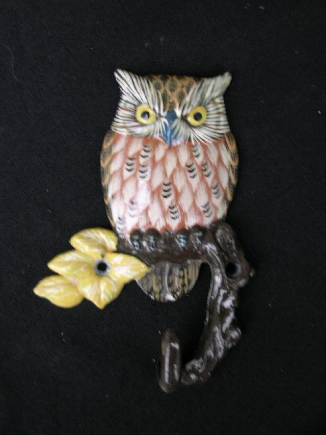 Zabawny, plastikowy a precyzyjnie ręcznie umalowany sowi haczyk. Z dwiema dziurkami do umocowania. Delikatność cieniutkich śladów pędzelka i trafność w doborze tonacji sowiego upierzenia :) Praktyczny, dowcipny, dekoracyjny. Oko cieszący :) i tego, co na nim zawiśnie - pilnujący :) 10 x 7,5 x 2,5 cm. Stan zachowania dobry.