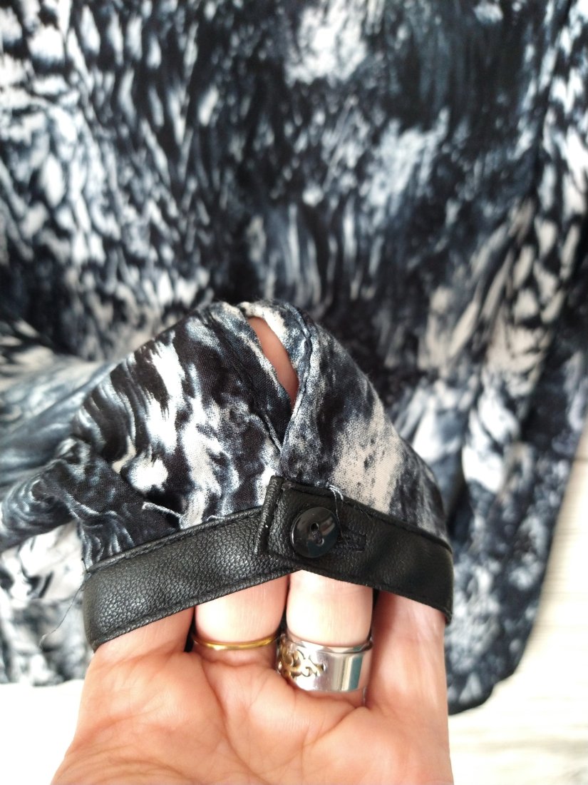 Rękawy zapinane na guzik, wykończone czarną skórą ekologiczną.