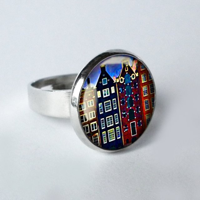Oryginalny, nieduży pierścionek z okrągłym oczkiem z unikatową grafiką artystyczną, umieszczoną pod szklanym kaboszonem (wypukłym szkiełkiem) i oprawioną w bazę w kolorze srebrnym (nie zawiera niklu i ołowiu, hipoalergiczna). Grafika jest najwyższej jakości, wywołana na wysokiej klasy papierze fotograficznym.