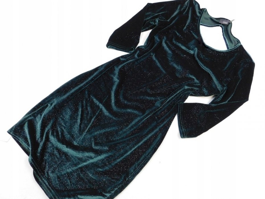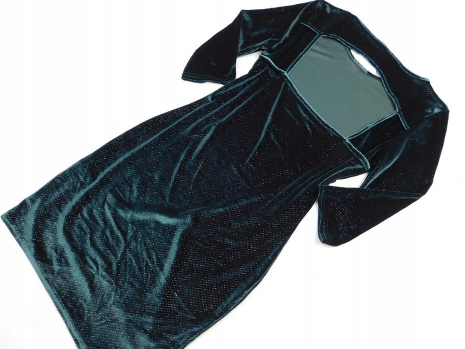 Welurowa sukienka w ciemnym odcieniu zieleni, lekko mieniąca się, na plecach wycięcie. Stan bdb.