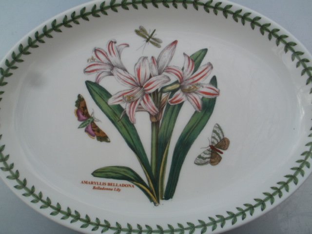 Porcelanowy półmisek z założenia do podawania steków. Sygnowany Portmeirion. To u nich powstały magiczne serie The Botanic Garden, The Magic Garden, The Birds of England... Założona na początku lat 50-tych manufaktura postawiła na jakość wyrobów i wytworne artystyczne zdobienia, inspirowane naturą. Wśród setek wyszukanych form i przedmiotów - a wszystkie użytkowe !! porcelanowe, jakościowe; ) Szlachetna, mocna, dźwięczna porcelana. Praktyczna nie tylko na steki owalna forma ze zdobieniami autorstwa Susan Williams Ellis - tu Amarylis Belladona , charakterystyczne motylki i szlaczek. Zywe radosne barwy, Wykończenie satynowo - błyszczące. Od spodu ryflowania matowe, nie szkliwione fire & ice :) Sygnatura Portmeirion, Dishwasher, microwave, freezer save . Made in Britain. Zachowała się również oryginalna papierowa metka sklepowa ;) Użytkowy, dekoracyjny i nad wyraz praktyczny ;)