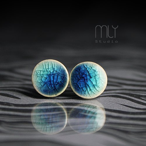 Ceramiczne kolczyki w formie sztyftów, ręcznie wykonane z delikatnej gliny kamionkowej jednostronnie szkliwione błękitnym szkliwem z efektem plamek i spękań, na antyalergicznych sztyftach w kolorze srebrnym. Średnica ok. 11mm.Polecam