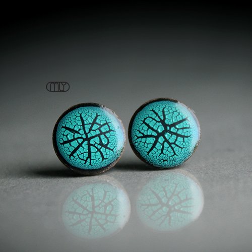 Ceramiczne kolczyki w formie sztyftów, ręcznie wykonane z delikatnej gliny kamionkowej jednostronnie szkliwione ciemnogranatowym i zielonym, lekko strukturalnym szkliwem z efektem plamek i spękań, na antyalergicznych sztyftach w kolorze srebrnym. Średnica ok. 11mm.Polecam