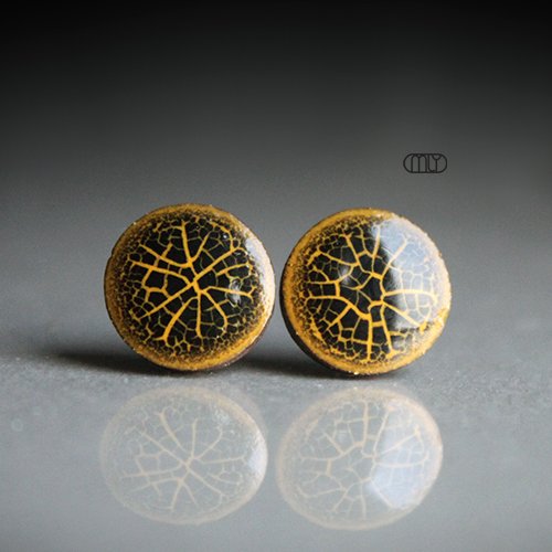 Ceramiczne kolczyki w formie sztyftów, ręcznie wykonane z delikatnej gliny kamionkowej jednostronnie szkliwione żółtym i czarnym szkliwem z efektem plamek i spękań, na antyalergicznych sztyftach w kolorze srebrnym. Średnica ok. 11mm.Polecam