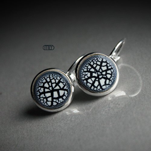 Okrągłe ceramiczne kolczyki, ręcznie wykonane z delikatnej jasnobeżowej gliny kamionkowej, szkliwione mieszanką granatowych i białych szkliw z efektem plamek, na zamkniętych biglach w kolorze srebrnym. Średnica elementu ceramicznego ok. 12mm, długość bigla ok 19mm. Polecam
