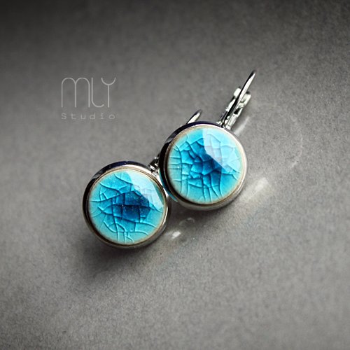 Okrągłe ceramiczne kolczyki, ręcznie wykonane z delikatnej jasnobeżowej gliny kamionkowej, szkliwione mieszanką turkusowych szkliw z efektem plamek i spękań, na zamkniętych biglach w kolorze srebrnym. Średnica elementu ceramicznego ok. 12mm, długość bigla ok 19mm. Polecam