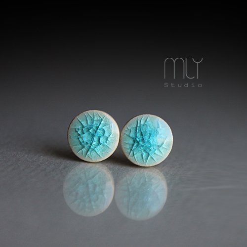 Ceramiczne kolczyki w formie sztyftów, ręcznie wykonane z delikatnej gliny kamionkowej jednostronnie szkliwione turkusowo błękitnym szkliwem z efektem plamek i spękań, na antyalergicznych sztyftach w kolorze srebrnym. Średnica ok.6mm.Polecam
