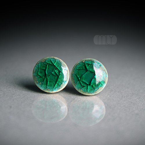Ceramiczne kolczyki w formie sztyftów, ręcznie wykonane z delikatnej gliny kamionkowej jednostronnie szkliwione zielonym szkliwem z efektem plamek i spękań, na antyalergicznych sztyftach w kolorze srebrnym. Średnica ok. 9mm.Polecam