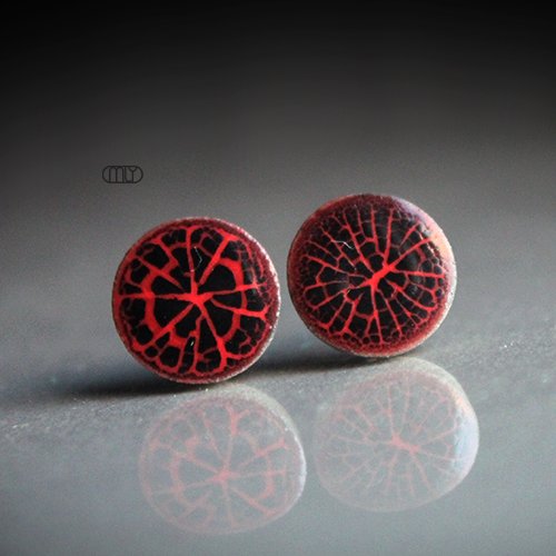 Ceramiczne kolczyki w formie sztyftów, ręcznie wykonane z delikatnej gliny kamionkowej jednostronnie szkliwione czerwonym i czarnym szkliwem z efektem plamek i spękań, na antyalergicznych sztyftach w kolorze srebrnym. Średnica ok. 9mm.Polecam