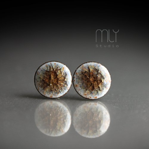 Ceramiczne, lekko nieregularne kolczyki w formie sztyftów, ręcznie wykonane z delikatnej gliny kamionkowej, jednostronnie szkliwione efektownym kremowo brązowym szkliwem z efektem spękań i pięknym połyskiem, na antyalergicznych sztyftach w kolorze srebrnym.Średnica ok. 9mm. Polecam