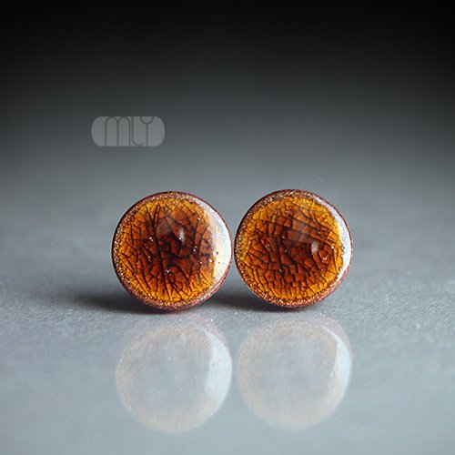 Ceramiczne, lekko nieregularne kolczyki w formie sztyftów, ręcznie wykonane z delikatnej gliny kamionkowej, jednostronnie szkliwione efektownym kremowo brązowym szkliwem z efektem spękań i pięknym połyskiem, na antyalergicznych sztyftach w kolorze srebrnym.Średnica ok. 11mm. Polecam