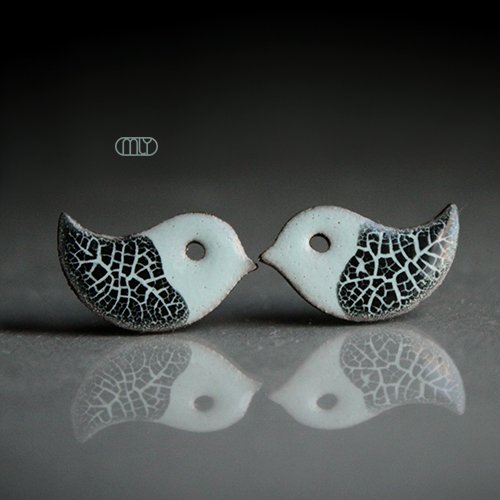 Efektowne kolczyki w formie sztyftów, ręcznie wykonane z delikatnej kamionki, jednostronnie szkliwione błękitnym i czarnym szkliwem z efektem plamek i spękań, na antyalergicznych sztyftach w kolorze srebrnym.długość elementu ceramicznego ok. 17mm, wykonywane na zamówienie - rozmieszczenie spękań może nieznacznie różnić się od widocznego na zdjęciu Polecam