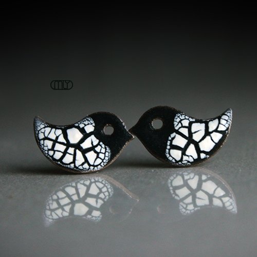 Efektowne kolczyki w formie sztyftów, ręcznie wykonane z delikatnej kamionki, jednostronnie szkliwione biało granatowym szkliwem z efektem plamek i spękań, na antyalergicznych sztyftach w kolorze srebrnym.długość elementu ceramicznego ok. 17mm, wykonywane na zamówienie - rozmieszczenie spękań może nieznacznie różnić się od widocznego na zdjęciu Polecam