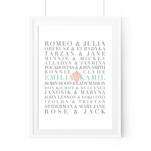 W zamówieniu podaj dwa imiona, które mają pojawić się na plakacie oraz datę, która ma być umieszczona w serduszku.