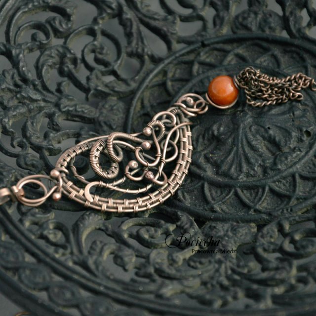 Stworzyłam go z miedzi i jadeitu o pięknej rudej barwie. Zwieńczeniem wisiora jest chwost wykonany z łańcuszków.