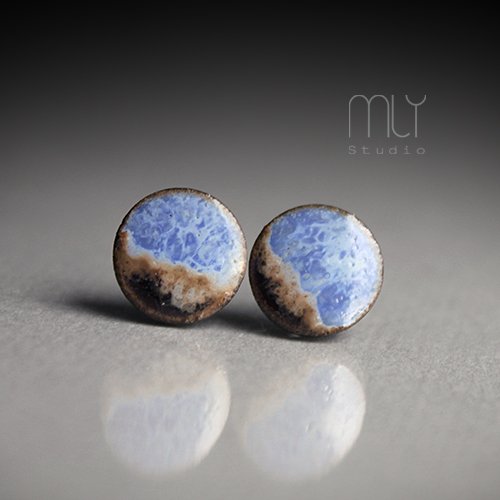 Ceramiczne okrągłe kolczyki w formie sztyftów, ręcznie wykonane z delikatnej gliny kamionkowej, jednostronnie szkliwione mieszanką brązowych i szarobłękitnych szkliw z efektem plamek, na antyalergicznych sztyftach w kolorze srebrnym. Średnica ok. 11mm. Polecam