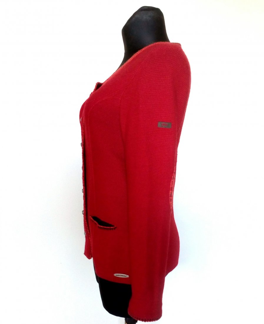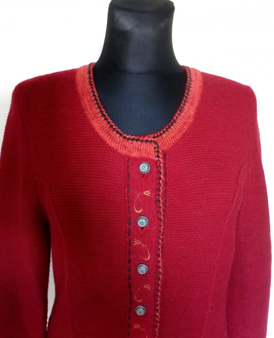 Czerwony, taliowany kardigan zapinany na ozdobne, metalowe, grawerowane guziki o stożkowej formie, z przodu i na plecach naszyta pionowa, haftowana listwa, na łokciach naszyte łatki, u dołu przodu małe, wpuszczane kieszenie