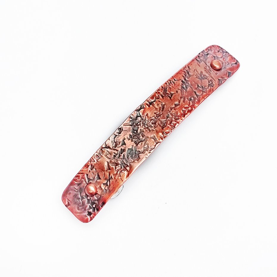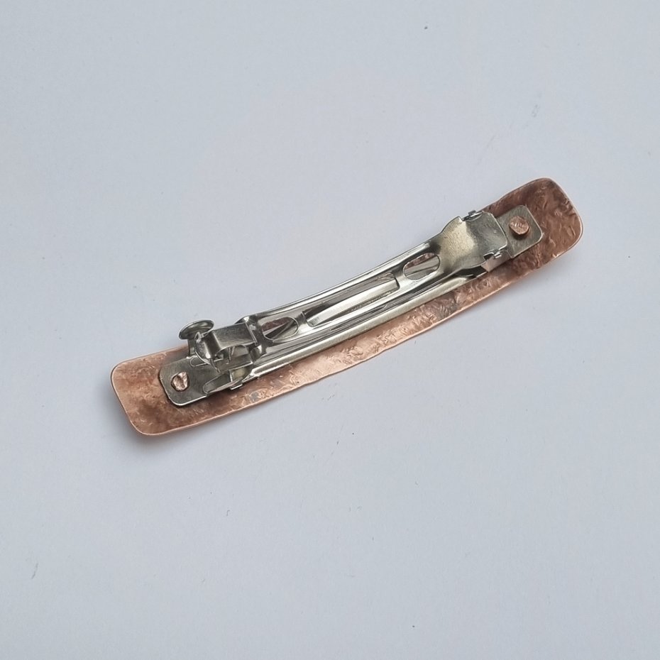 Spinka do włosów z elementem z czystej, polskiej miedzi. Standardowe, stalowe zapięcie. Ręczne kucie i nitowanie do zapięcia. Wyrób oksydowany i ręcznie przecierany. Elementy miedziane noszone na głowie mogą pomagać w uwalnianiu od bólu i są doskonałym odpromiennikiem.