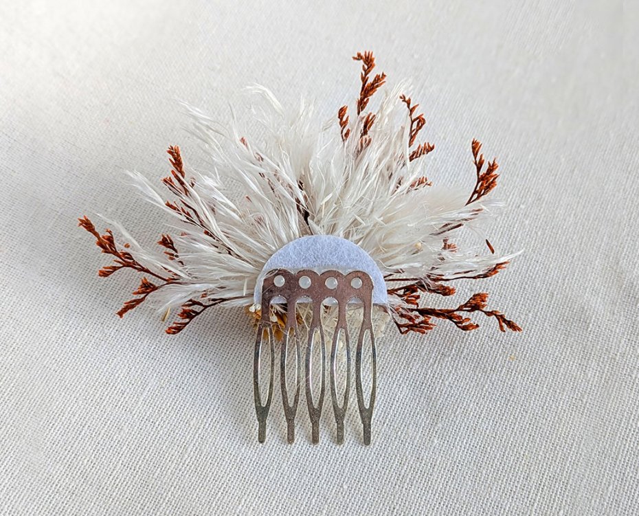 Wyjątkowa spinka do włosów "Brązowa Łąka" wykonana z naturalnych, starannie suszonych kwiatów, które zachwycają swoją autentycznością i subtelnym pięknem. Kompozycja w ciepłych, ziemistych odcieniach brązu, beżu i delikatnej zieleni przywołuje klimat spokojnej, jesiennej łąki, dodając stylizacji naturalnego uroku i elegancji. Każda spinka jest unikatowa – układ kwiatów może się nieznacznie różnić, co podkreśla jej rękodzielniczy charakter. Solidna baza zapewnia wygodne i stabilne utrzymanie we włosach, dzięki czemu idealnie sprawdzi się zarówno na co dzień, jak i podczas wyjątkowych okazji. To doskonały wybór dla osób ceniących naturę, oryginalność i delikatne, romantyczne dodatki.