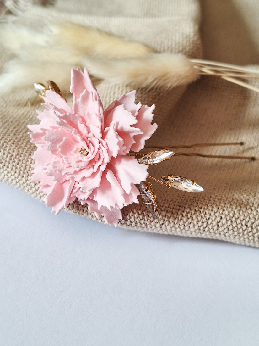 Wyjątkowa kokówka w formie dużego, ręcznie wykonanego kwiatu goździka w pastelowym różu. Umieszczony na złotym drucie julilerskim, ozdobiony kryształkami o pięknym szlifie, tworzą spektakularny i romantyczny dodatek.