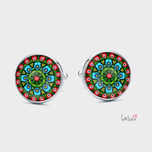 Ręcznie robione spinki do mankietów z wysokiej jakości grafiką zamkniętą pod wypukłym szkiełkiem i oprawione w bazę w kolorze srebrnym.