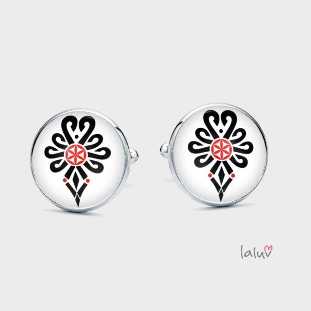 Ręcznie robione spinki do mankietów z wysokiej jakości grafiką zamkniętą pod wypukłym szkiełkiem i oprawione w bazę w kolorze srebrnym.