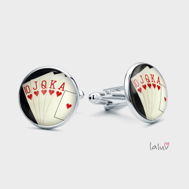 Ręcznie robione spinki do mankietów z wysokiej jakości grafiką zamkniętą pod wypukłym szkiełkiem i oprawione w bazę w kolorze srebrnym.