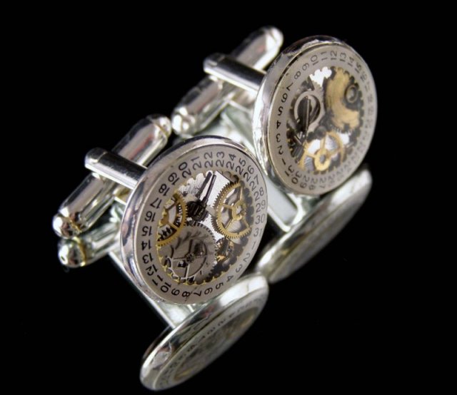 Niesamowite spinki do mankietów w stylu steampunk :) Piękna metalowa oprawa w kolorze srebrnym i zatopione w żywicy zegarkowe różności. Średnica ok 1,8 cm.