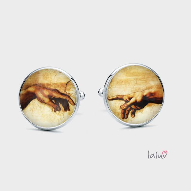 Ręcznie robione spinki do mankietów z wysokiej jakości grafiką zamkniętą pod wypukłym szkiełkiem i oprawione w bazę w kolorze srebrnym.