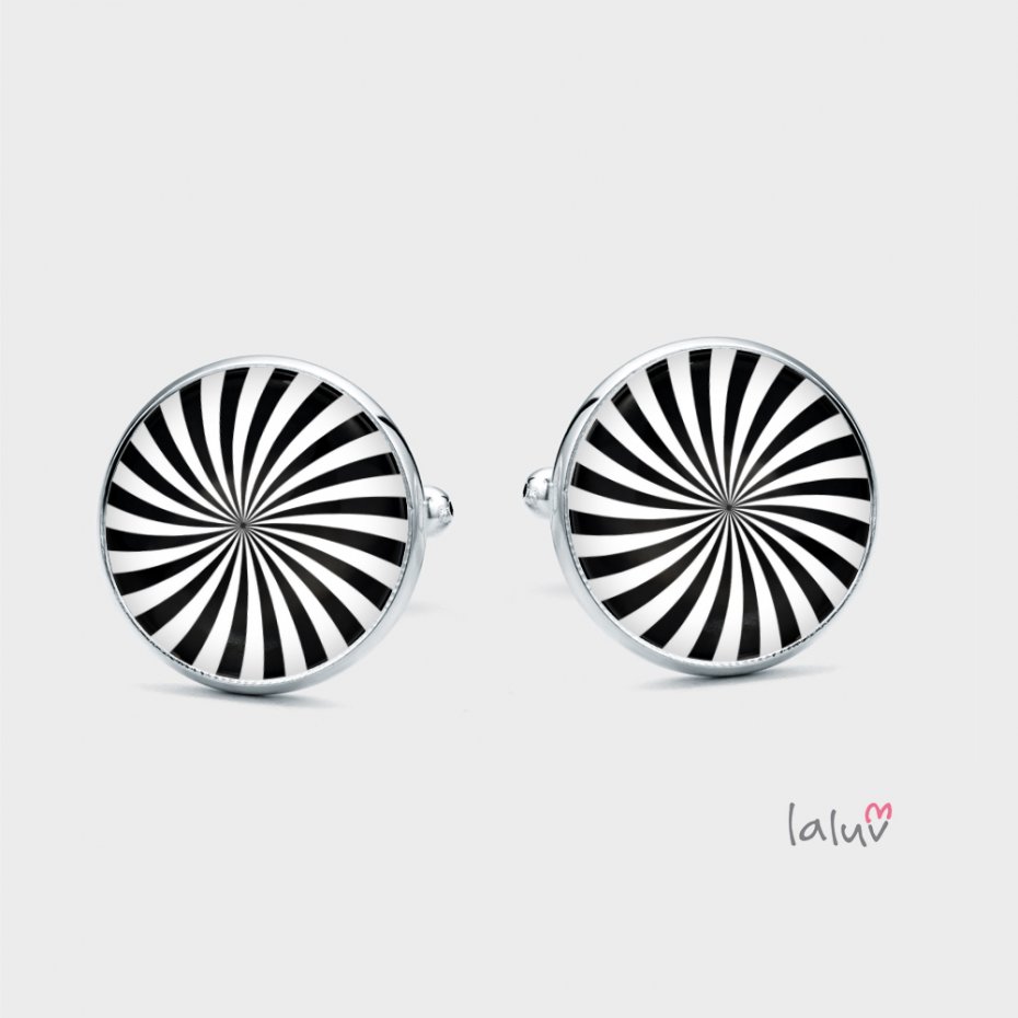 Ręcznie robione spinki do mankietów z wysokiej jakości grafiką zamkniętą pod wypukłym szkiełkiem i oprawione w bazę w kolorze srebrnym.
