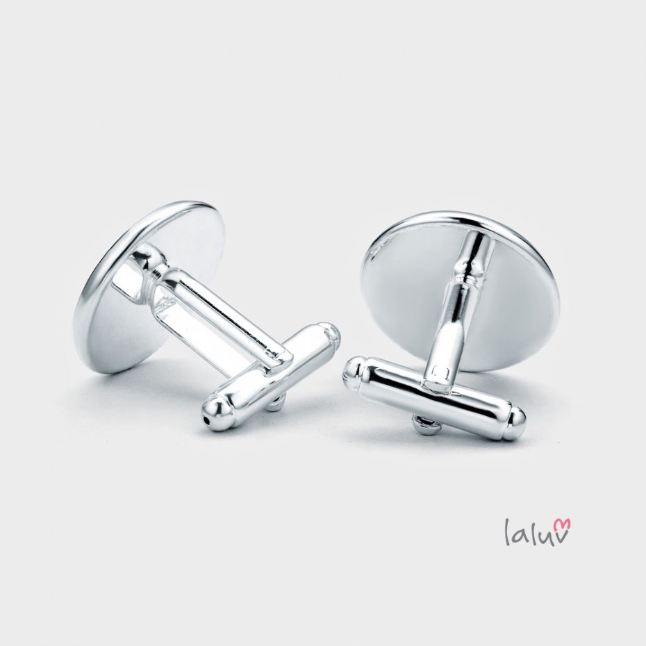 Ręcznie robione spinki do mankietów z wysokiej jakości grafiką zamkniętą pod wypukłym szkiełkiem i oprawione w bazę w kolorze srebrnym.