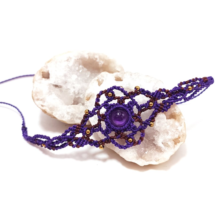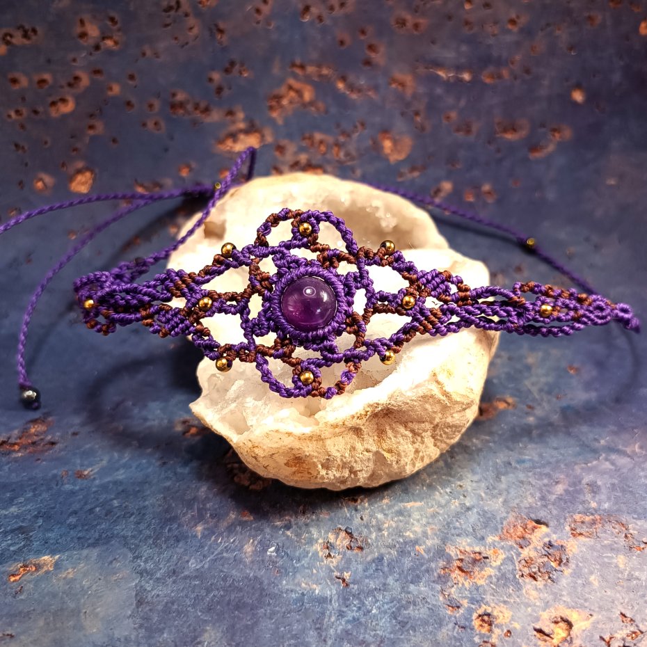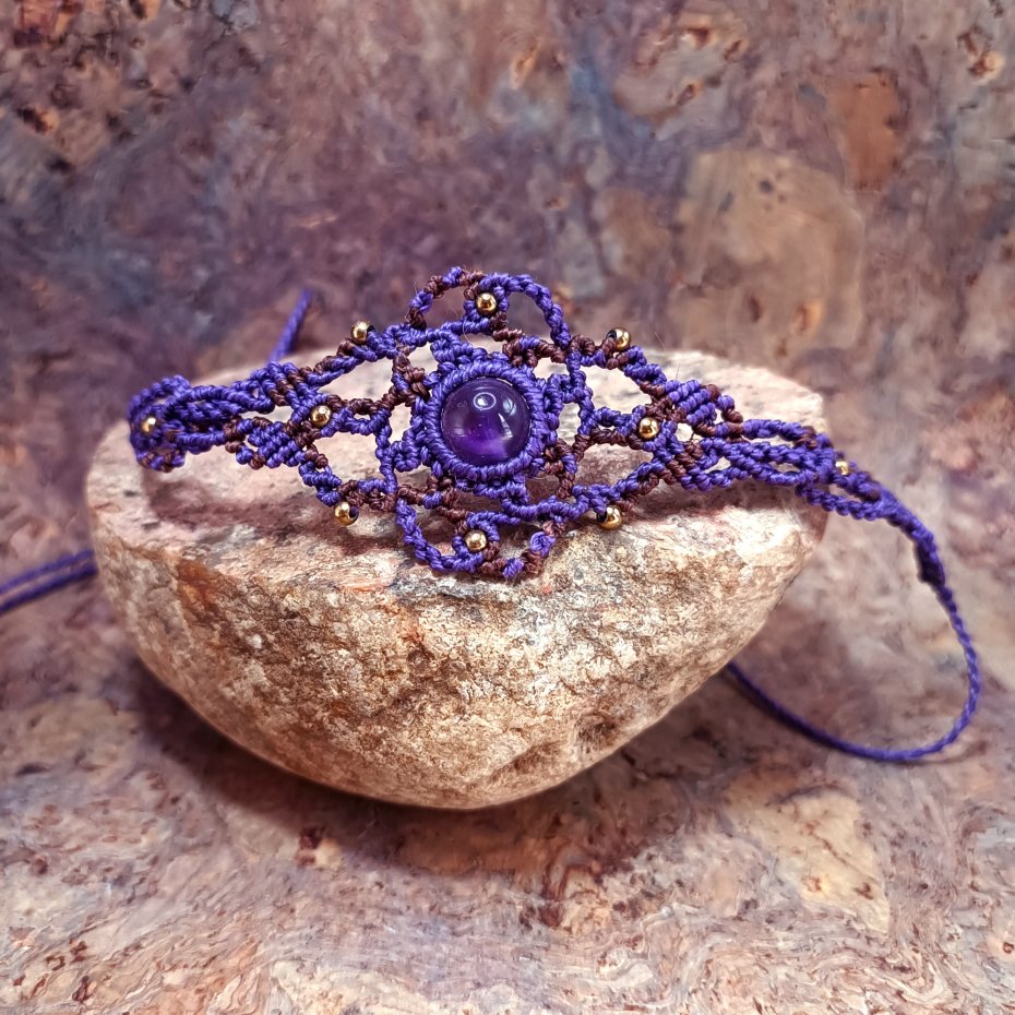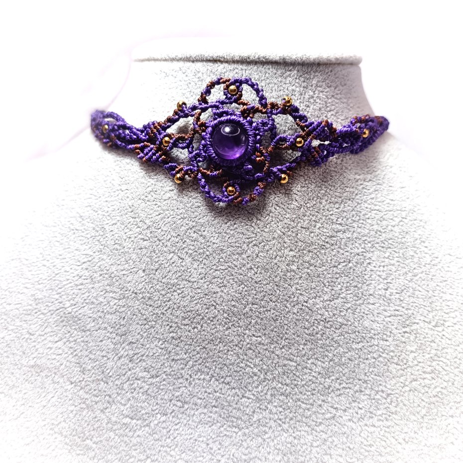 Naszyjnik - choker pleciony, fioletowo brązowy z ametystem naturalnym