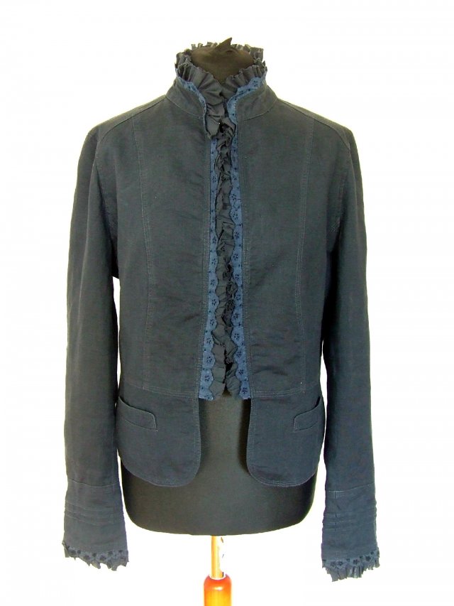 Uroczy granatowy lniany żakiet ładnie skrojony, z licznymi modelującymi zaszewkami, zapinany z przodu na haftki. Z przodu dwie kieszonki. Przy mankietach i zapięciu ładne ozdobne falbanki.