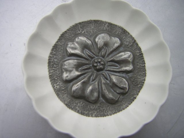 ArcyCiekawy porcelanowy niewielki talerzyk - spodeczek. Sygnowany Spode Velamour england. Szlachetna, dźwięczna porcelana w rozbielonym beżu na satynowo - matowo wykończona. Fakturowy, falbankowy rant. Wewnątrz metalowa ( Sic !) Przestrzenna dekoracja. Metal wygląda na cynę. Wyczuwalnia pod dłonią, szlachetny. ..Fantastyczna rzecz do dekoracji, użytkowa I ozdobna. Nadaje się na elegancki prezent;)