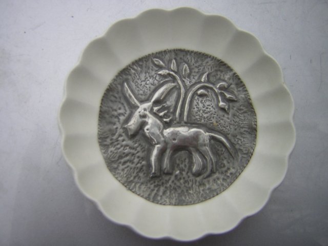 ArcyCiekawy porcelanowy niewielki talerzyk - spodeczek. Sygnowany Spode Velamour england. Szlachetna, dźwięczna porcelana w rozbielonym beżu na satynowo - matowo wykończona. Fakturowy, falbankowy rant. Wewnątrz metalowa ( Sic !) Przestrzenna dekoracja. Metal wygląda na cynę. Wyczuwalnia pod dłonią, szlachetny. ..Fantastyczna rzecz do dekoracji, użytkowa I ozdobna. Nadaje się na elegancki prezent;)