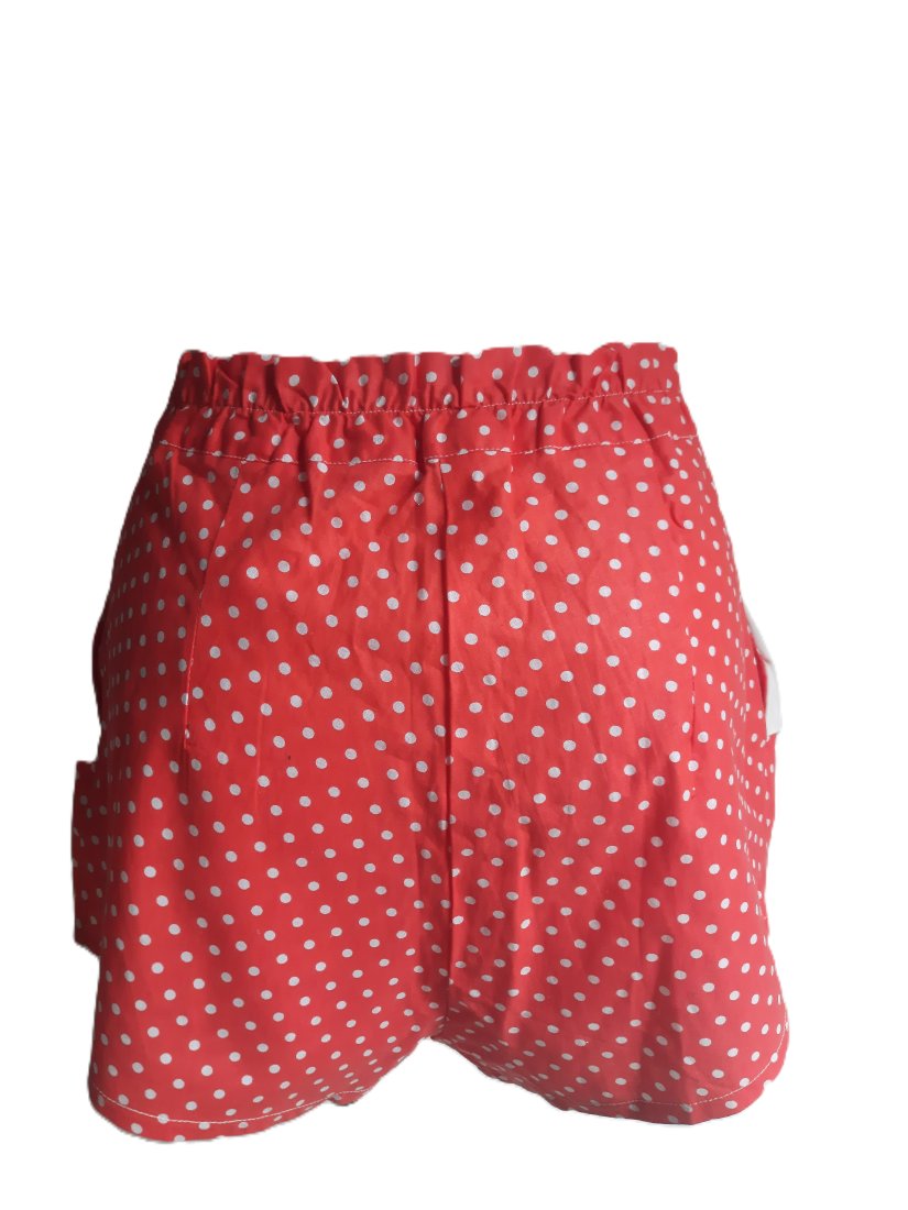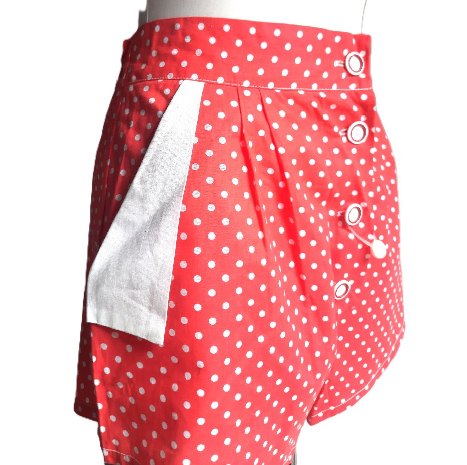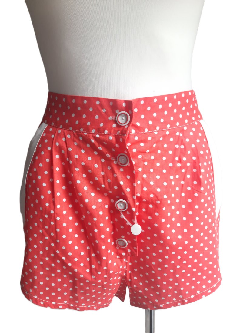 świetne krótkie letnie szorty vintage z lat 80-tych w kolorze czerwonym w drobne białe kropki (czerwony kolor jest bardziej blady niż na zdjęciach), po bokach dwie płytkie kieszenie z białymi klapkami, szorty zapinane z przodu na guziki, z tyłu w pasie wszyta gumka, lekko podwyższony stan, nigdy nienoszone, posiadają jeszcze papierową metkę (na zdjęciu plastikowe zapięcie od metki - metka niestety się oderwała)