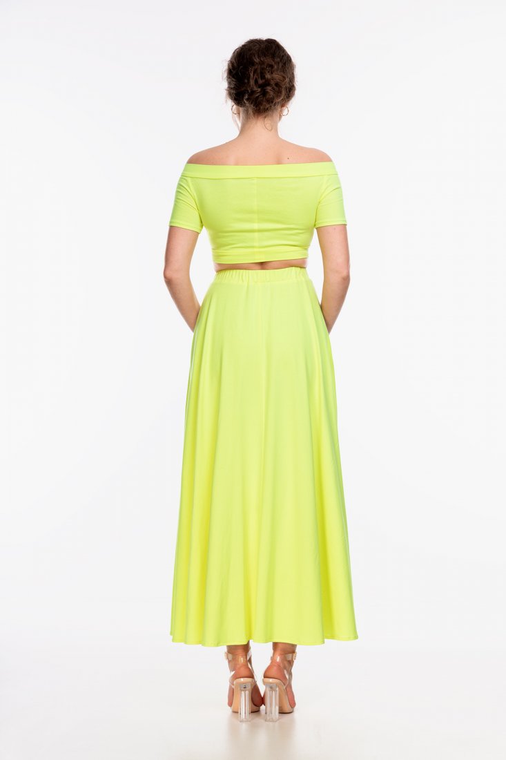 Spódnica maxi uszyta z dzianiny bawełnianej 100% w kolorze żółto-zielonym. Materiał jest naturalny i przewiewny, mięsisty, najwyższej jakości.