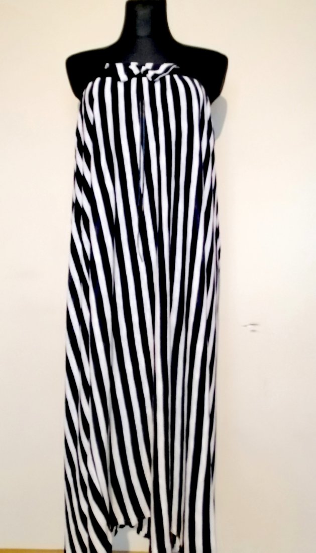 maxi spódnica, może być też sukienka, u góry na czarnej, szerokiej gumie, na gumie naszyta kokarda, od gumy marszczona, dzianina w biało - granatowe paski
