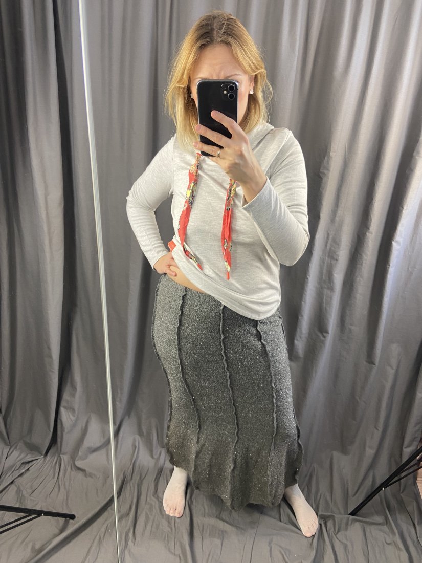 Dzianinowa miękka spódnica, z pasów. Z połyskiem. Marianne Hassler. Brak metki ze składem.